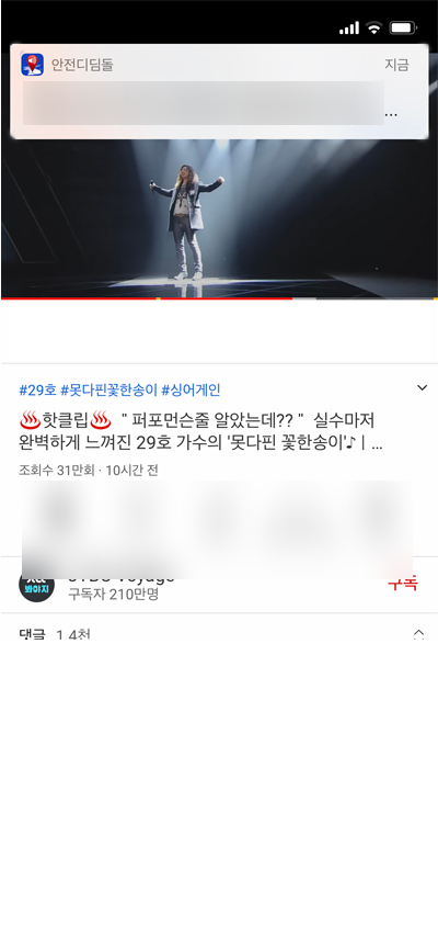 유튜브 등 미디어 재생중에도 상단 배너형태로 알림이 수신되므로, 미디어가 중단되지 않습니다.(우측)