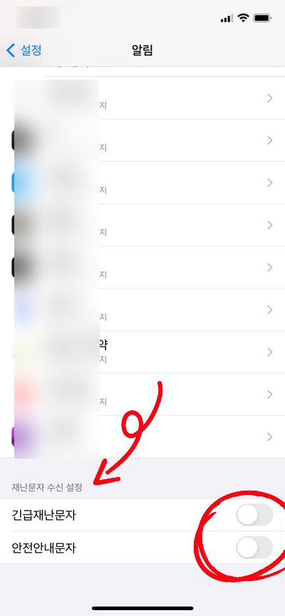 아이폰의 "기본 재난문자 수신"은 끄고,