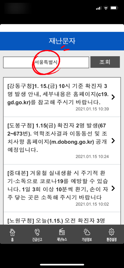 좌측 "석삼자"-"재난문자"-"지역 설정"으로, 과거 또는 지역별 재난문자 내용을 볼 수 있습니다.