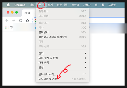 크롬에서는 상단 메뉴중 "수정"을 누르면 이모티콘을 적용할 수가 있습니다.