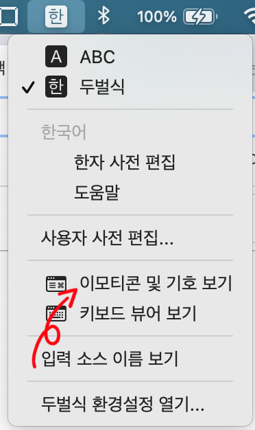 맥 우측상단의 "한영 전환 버튼"을 누르면, "이모티콘 및 기호보기"가 나옵니다.