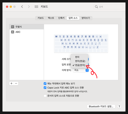 좌측의 "한 두벌식"을 선택한 후, 우측의 "입력포맷"을 눌러 원하는 형태의 입력방식(우측)을 선택하면 됩니다.