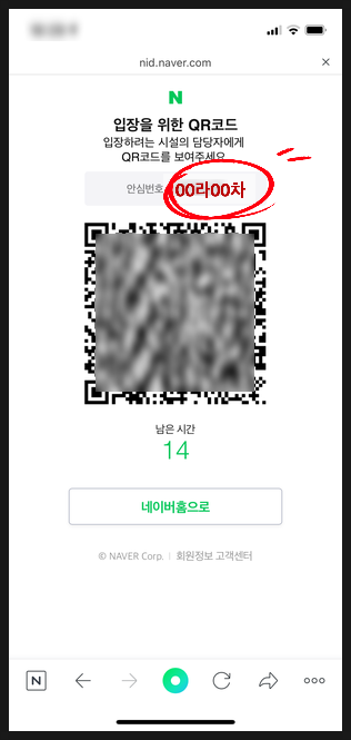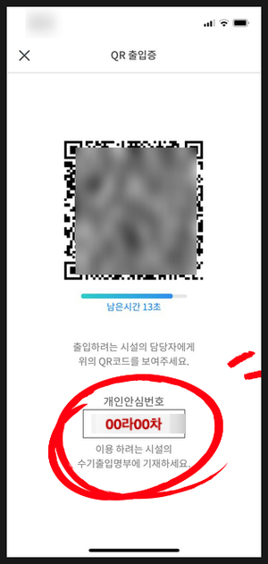 개인안심번호는 네이버나 카카오, 패스 등 인증기관을 통해 "QR코드 체크인"을 발급하면, QR코드 상단 또는 하단에 개인번호가 생성되며 한번 발급받으면 계속 사용할 수 있습니다.