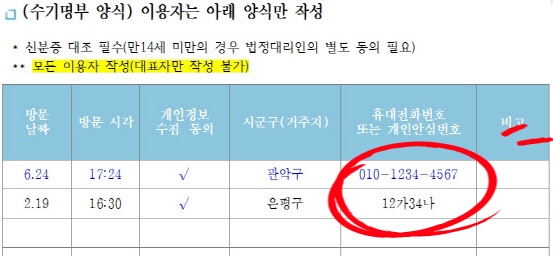 매장 입장시 기록하는 수기명부에 아래와 같이 휴대폰 번호 대신에 "개인안심번호"를 기입하면 됩니다.