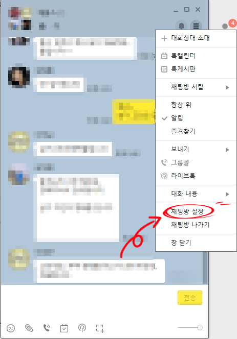 PC버전 카톡 해당 채팅방으로 들어가서, 다음의 순서대로 설정하면 됩니다.