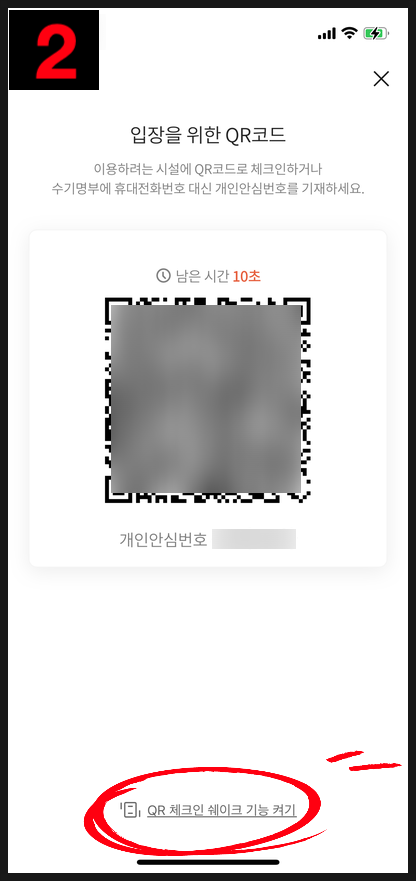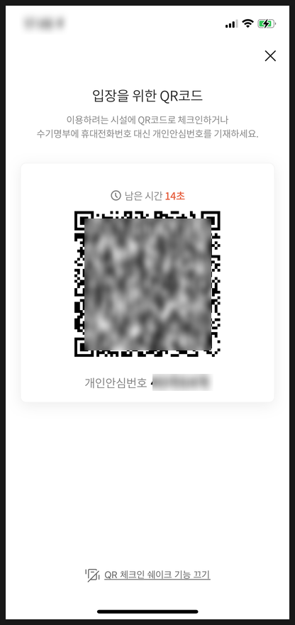 핸드폰을 2~3회 세게 흔들면, 아래와 같은 QR 체크인 화면이 호출됩니다.