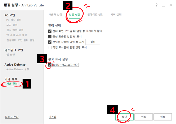 3.기타 설정의 "사용환경"→"알림설정"탭→"30일간 광고 보지 않기"체크→"확인"