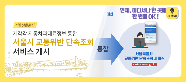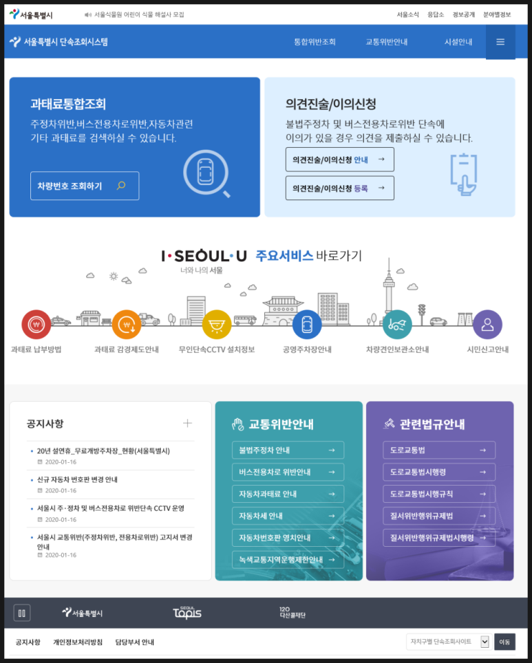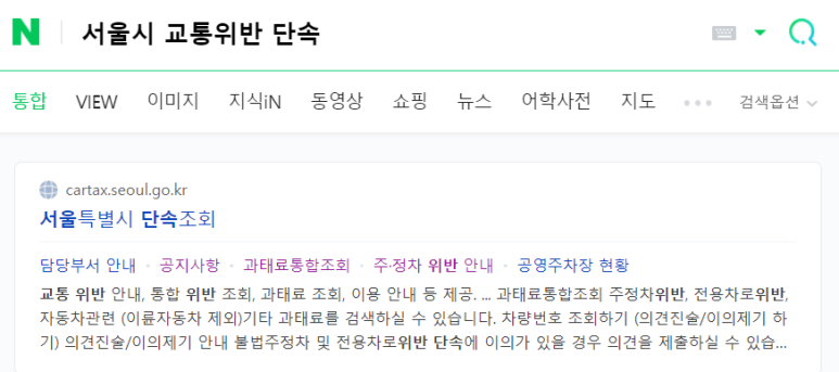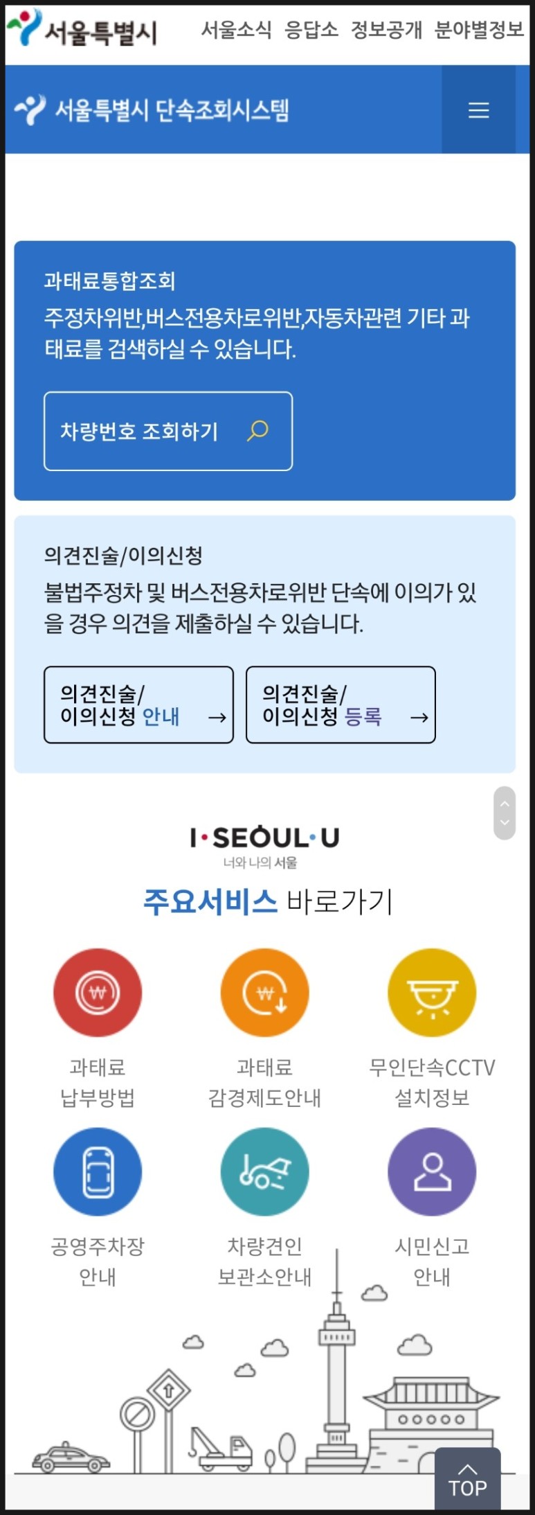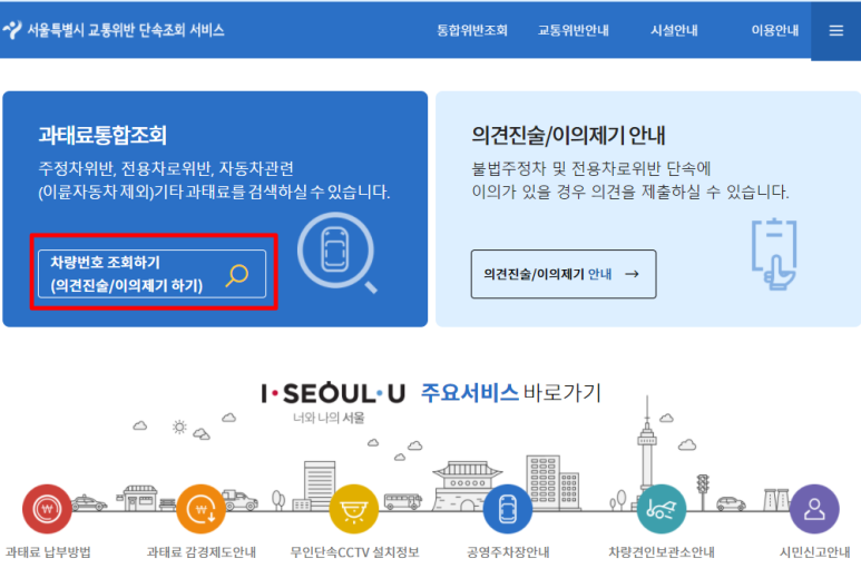 서울시 교통위반 단속조회 접속 ↓ '차량번호 조회하기' 선택 ↓ 본인인증 후 차량번호 입력 ↓ 과태료 정보 확인 및 미납 과태료 납부 한번에 가능! |
