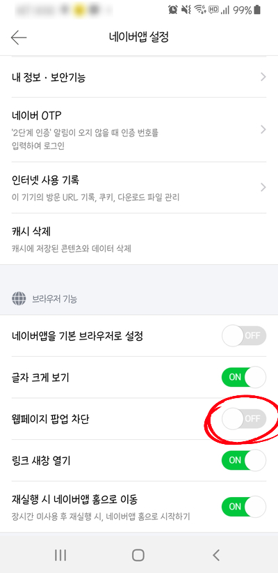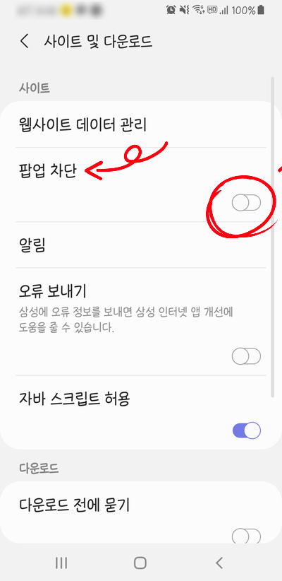 "웹페이지팝업차단"을 좌측으로 OFF하면 됨.