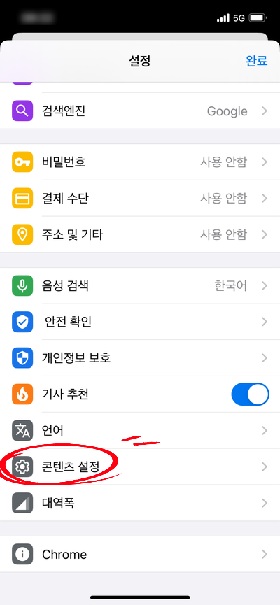 다음, "컨텐츠 설정"을 누릅니다.(우측)