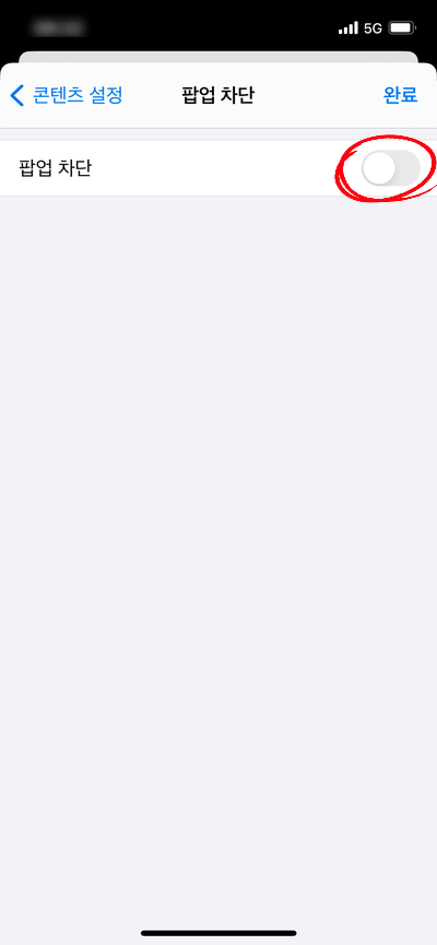 "팝업차단"을 좌측으로 Off해주면 됨(우측)