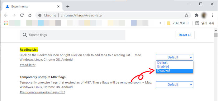 "Default"에서 "Disabled"로 바꾼 후(위),