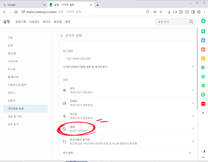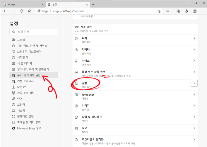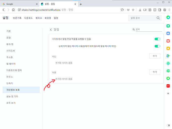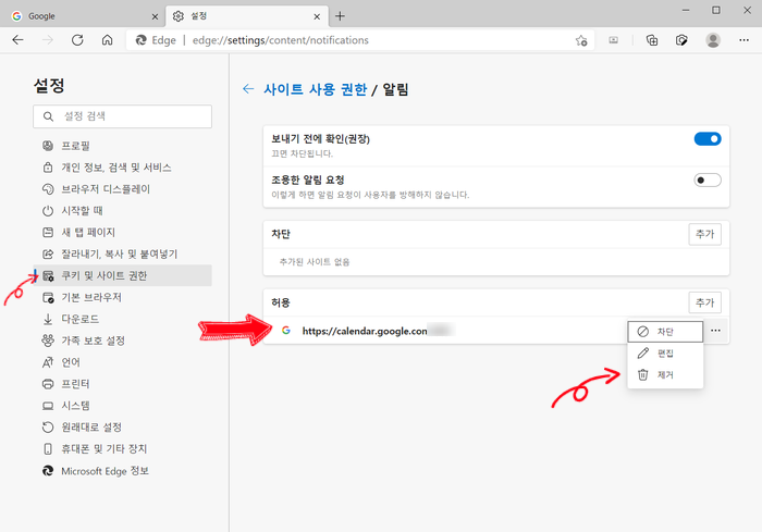 "알림"의 "허용"된 사이트를