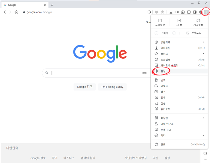 우측상단의 "점3개" >>"설정" 클릭