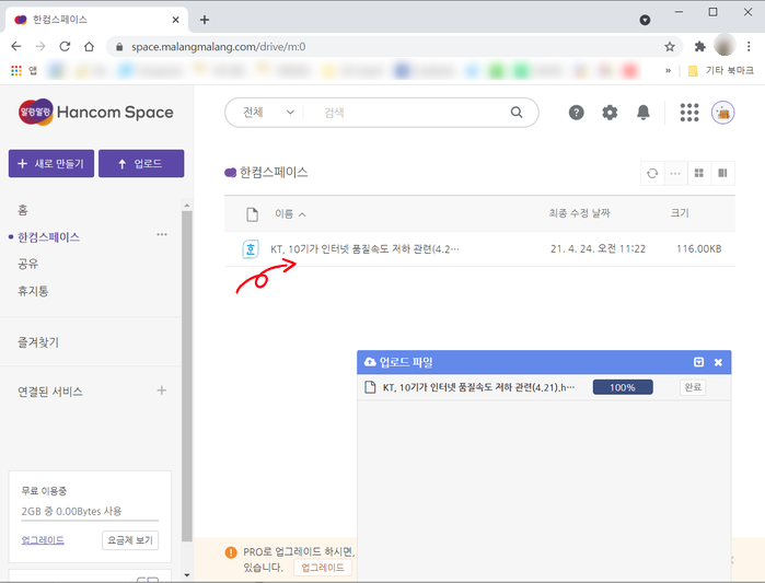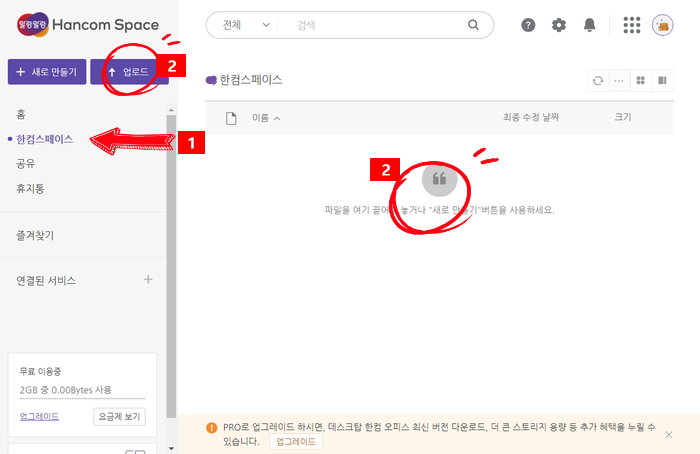 1.좌측 메뉴의 "한컴스페이스'클릭
