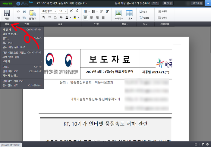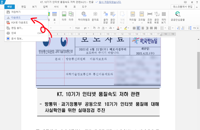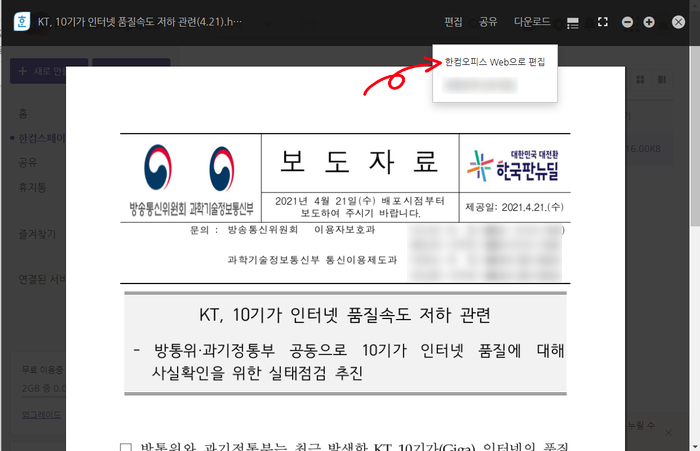 아래한글을 웹에서 무료 편집하는 것 중에서