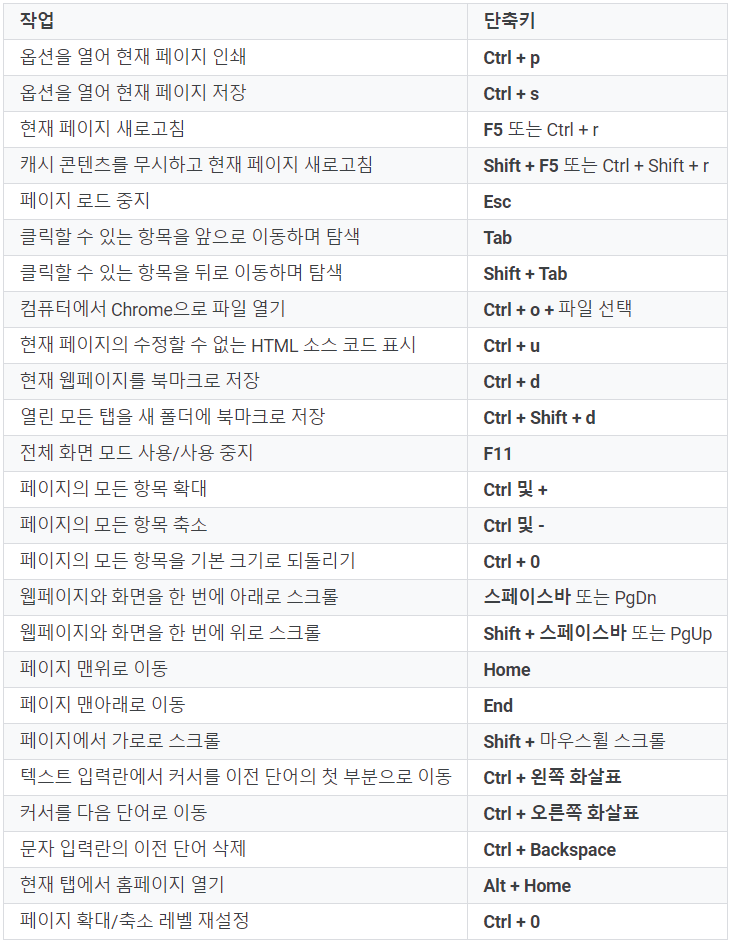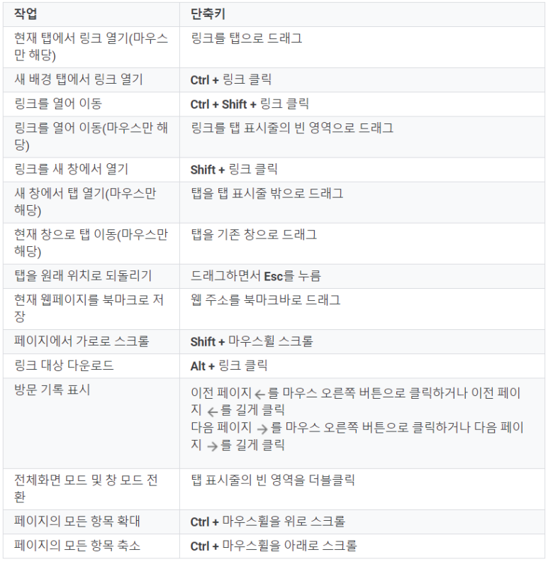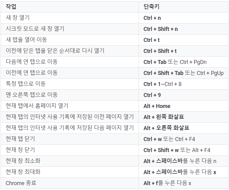 Windows용 크롬 단축키입니다.
