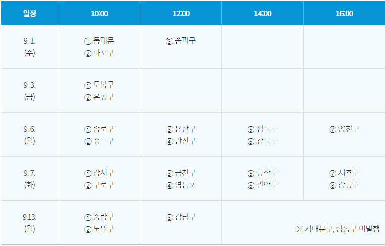 판매는 9월 1일부터 시작되며, 자치구별로 판매 날짜·시간이 다른 만큼 확인이 필요하다. 이번 3차 발행에는 서울시내 23개 자치구(서대문구, 성동구 제외)가 참여한다.