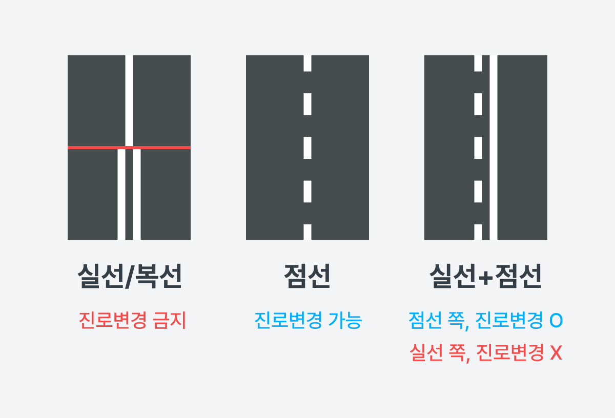 * 진로변경 금지 위반 : 진로변경은 점선 위에서만! 실선과 복선 위 진로변경은 참아주세요. (과태료 4만원)