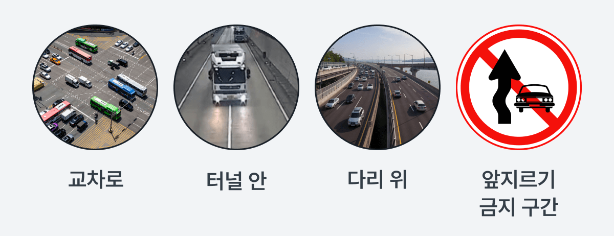 * 앞지르기 금지 장소 · 방법 위반 : 앞지르기 금지 표지판이 있는 곳은 물론 교차로같이 혼잡한 곳, 터널 안이나 다리 위처럼 폐쇄된 곳에선 앞지르기가 금지되어 있습니다. (과태료 7만원)