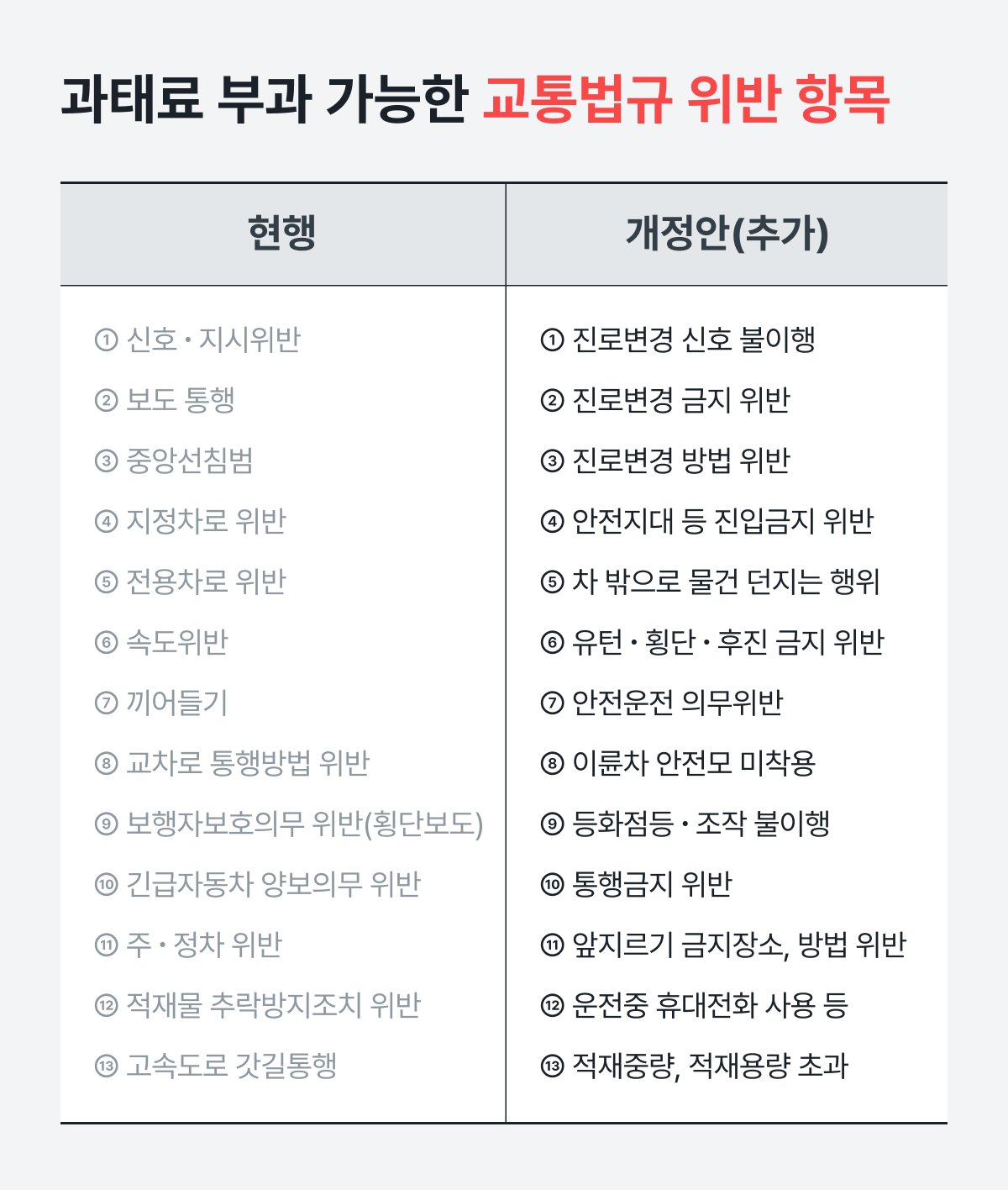 기존엔 범칙금이 운전자 대상으로 부과된다는 점에서, 교통법규 위반 사실에도 처벌이 사실상 어려웠습니다. 이에 올해 7월 도로교통법 개정하여 13개의 교통법규 위반 행위에 과태료 항목이 추가됐습니다.