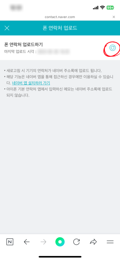 폰 연락처 업로드하기 우측의 동그란 버튼을 눌러 백업하면 됩니다.(우측)