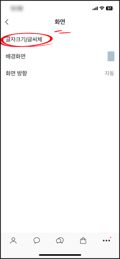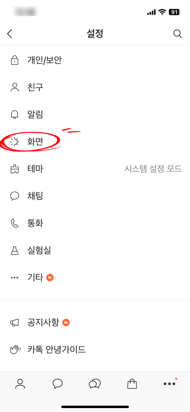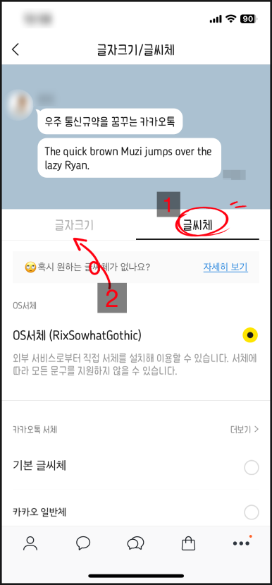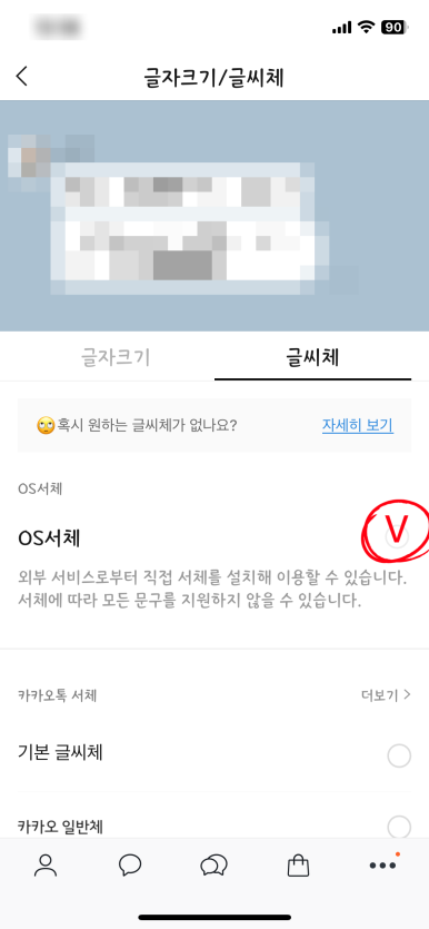 카톡 우측하단의 "점3개"-상단의 "설정"-"화면"-"글자크기/글씨체"를 터치한후, 중간의 "OS서체"를 터치합니다.