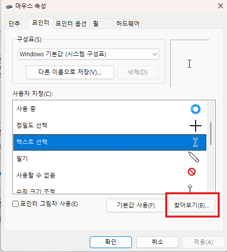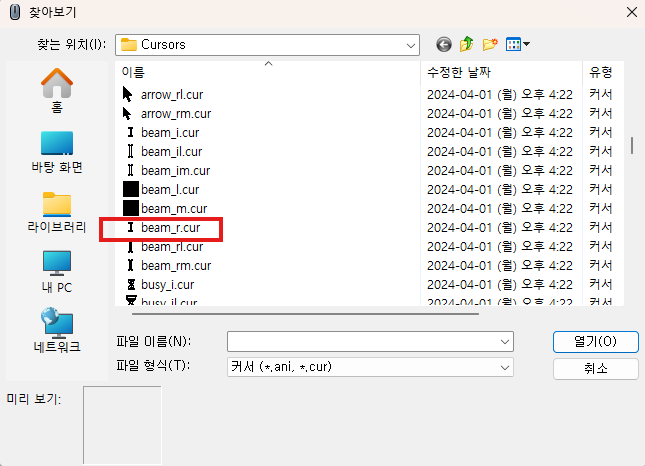 "beam_i.cur" 또는 "beam_r.cur" 을 선택하여 "열기"하면 반영됩니다.