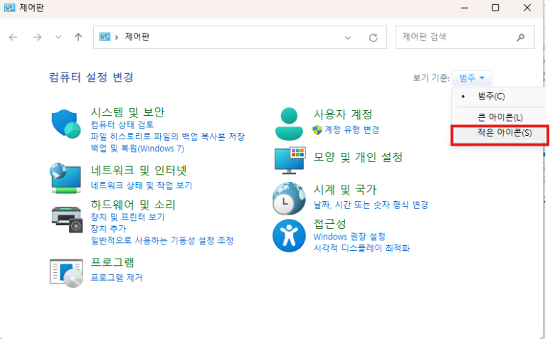 (2)-1. 제어판 화면에서, 우측의 보기기준을 "작은 아이콘(S)"변경하면,