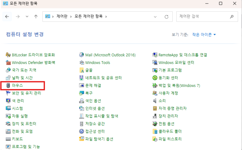 - 제어판으로 들어가서, 마우스 선택하여 하나만 변경하면 됩니다.