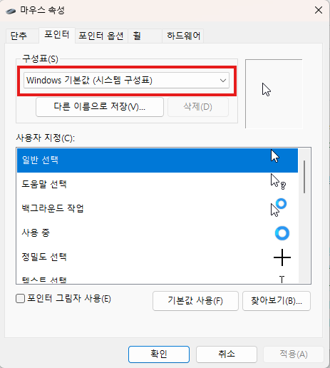 구성표를 "Windows기본값(시스템 구성표)" 선택 확인후,