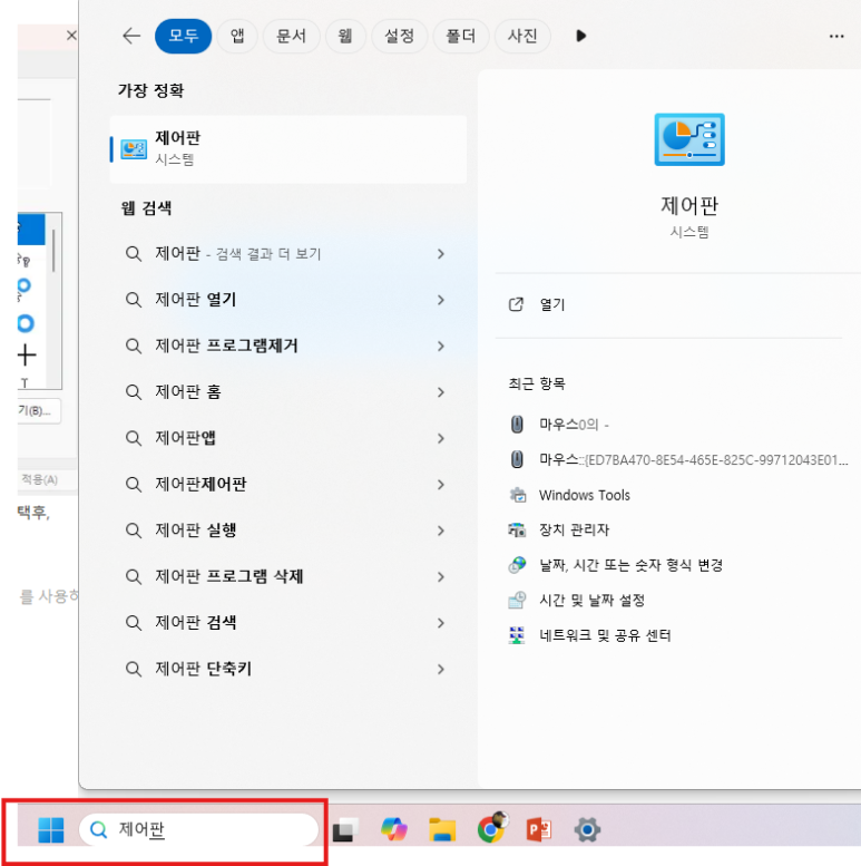 (1)먼저, 윈도우11 등 메인화면 검색창에서 "제어판"입력후 엔터