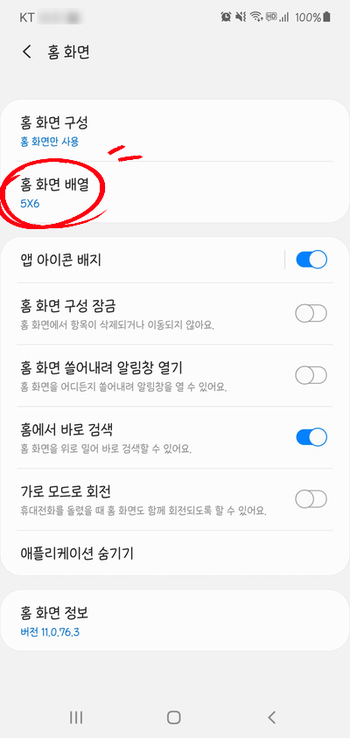 홈화면 1페이지당 앱 개수 및 크기 등의 조절은