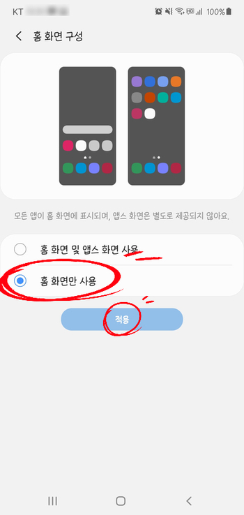 아래 그림처럼 "홈화면만 사용"을