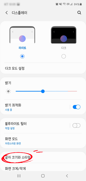 "설정">>"디스플레이">>"글자 크기와 스타일"로