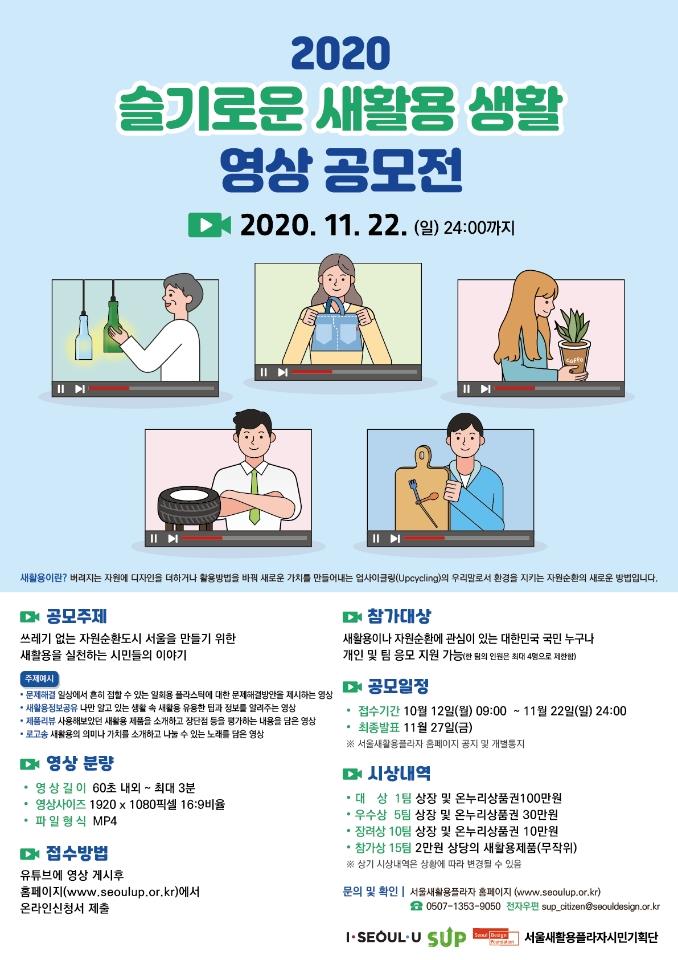 ▶공모방법은 서울새활용플라자 홈페이지(www.seoulup.or.kr)에서 참가양식을 내려 받아 작성한 뒤 동영상 URL과 함께 온라인으로 제출하면 된다.