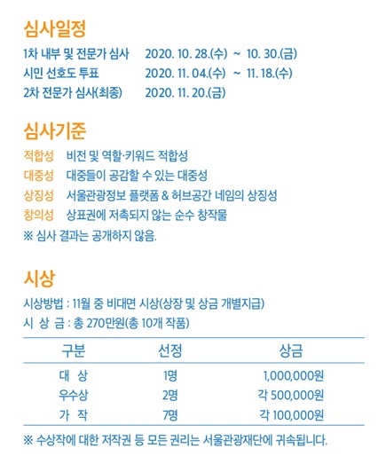 - 공모전의 세부일정은 변경될 수 있으며, 변경사항은 서울관광재단 홈페이지를 통해 공지됩니다.