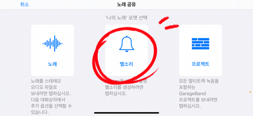 15. 공유를 눌러 나온 화면에서, 가운데 "벨소리"를 터치합니다.