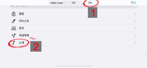 위 "음악"탭을 터치하고,