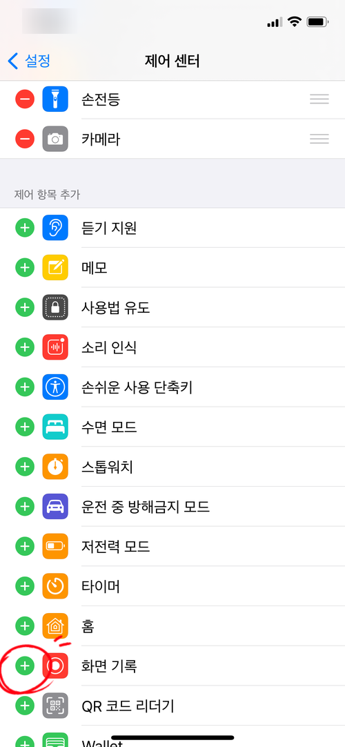 위와 같이 "설정-제어센터"로 들어가서(좌측), "화면기록"을 "+"를 눌러 추가하면(중앙), 제어센터에 등록(우측)이 됩니다.