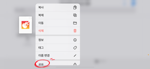 벨소리 파일이 들어와 있는 데, 동 파일을 한번 더 터치하고(좌측), "공유"를 터치합니다.(우측)