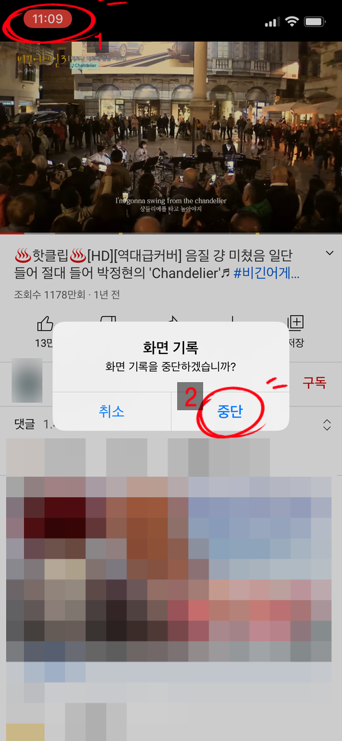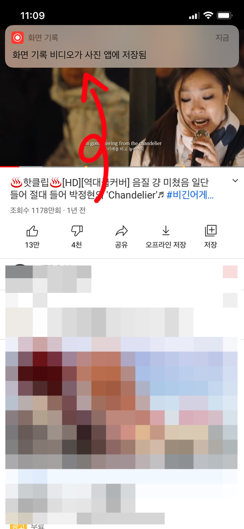 원하는 부분의 영상이 30초 이상 저장되었다고 생각이 되면, 좌측 상단 시계부분(빨간색은 녹화되고 있다는 의미)을 터치하여 "중단"을 터치하면, 우측과 같이 동영상이 "사진"앱에 저장이 됩니다.