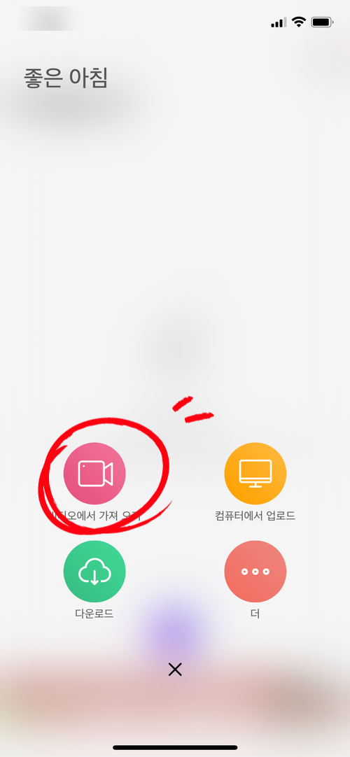 하단의 "+" 터치(좌측) >> "비디오에서 가져오기" 터치(중앙) >> 저장된 동영상을 선택합니다(우측)