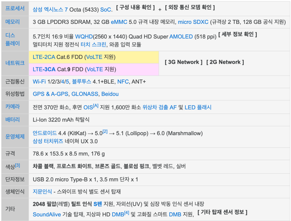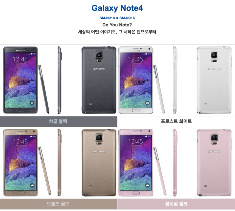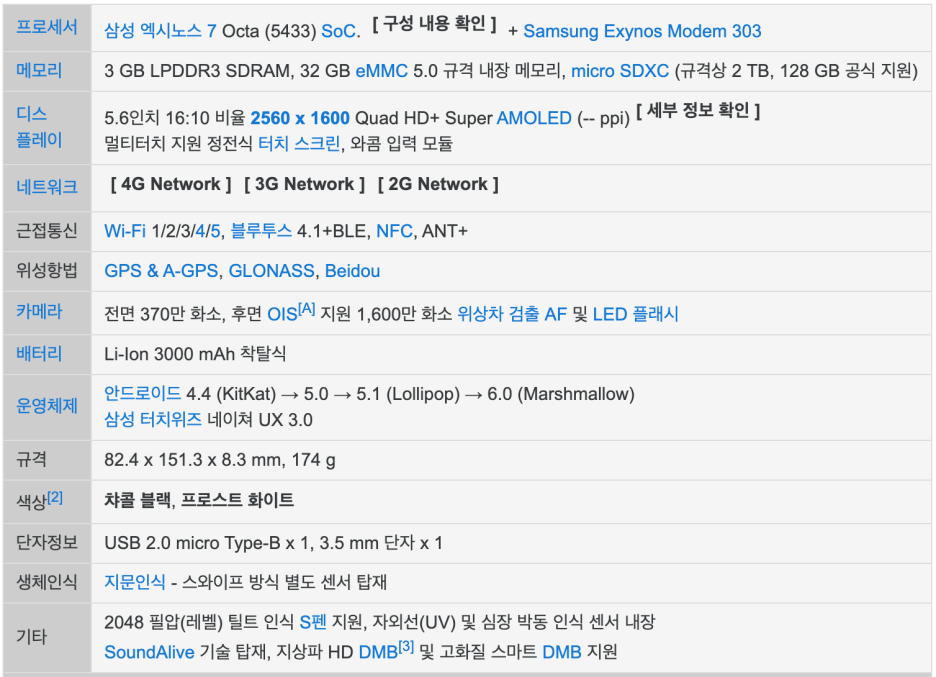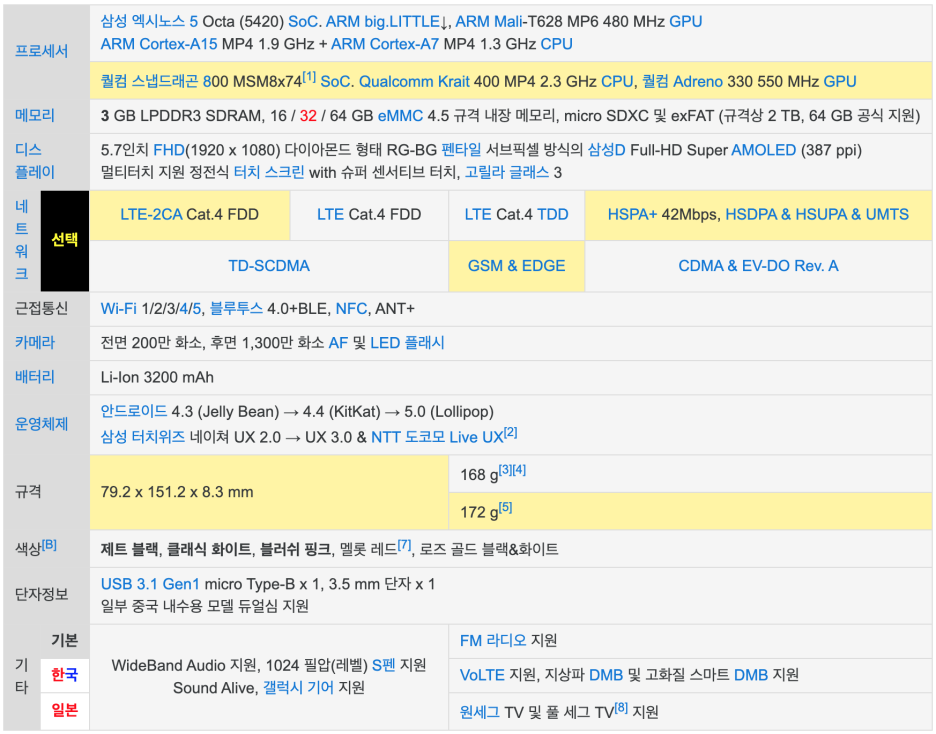 노트4 | SM-N910 | 5.7인치 16:9 비율 WQHD(2560 x 1440) Super AMOLED (158 ppi) | 78.6 x 153.5 x 8.5 | 176 | Li-Ion | OIS지원 1,600만 | 370만 | 14년 9월 |