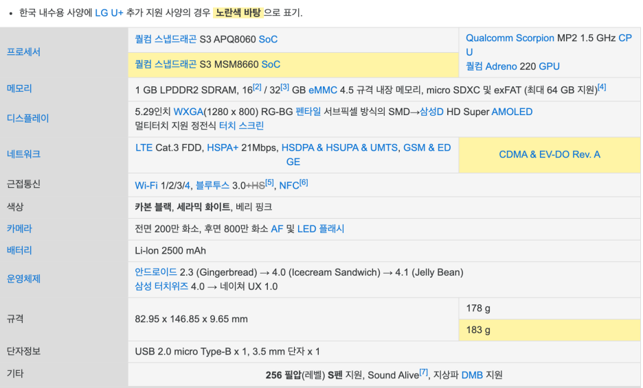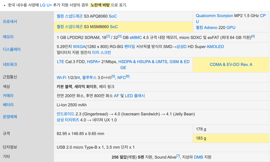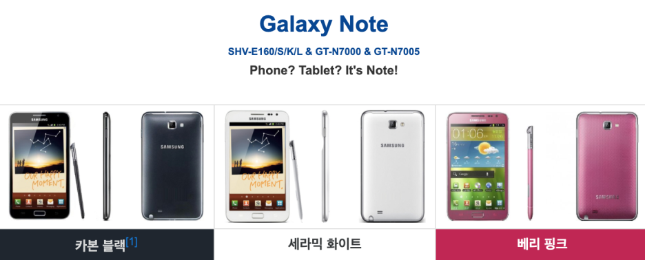 노트1 | SHV-E160 /S/K/L | 5.29인치 16:10비율WXGA(1280x800) | 82.95x | 178 | Li-Ion 착탈식 | 800만 | 200만 | 11년 9월 |