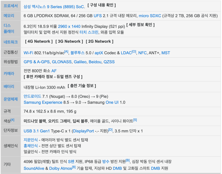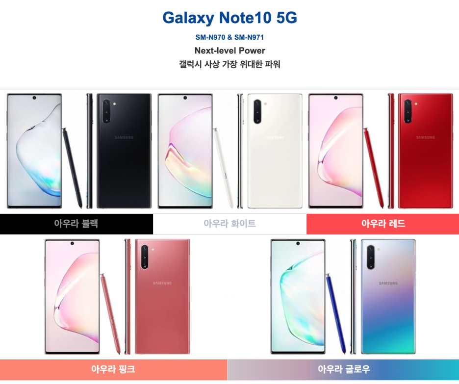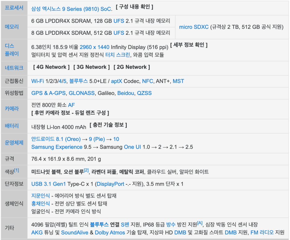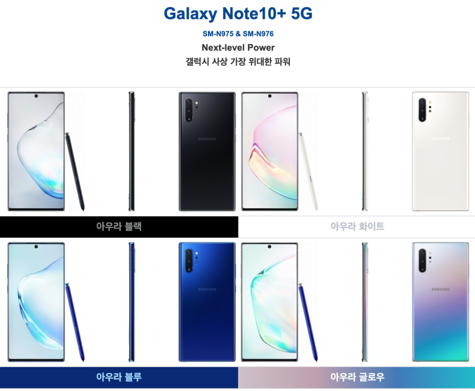 노트10 | SM-N970 | 6.3인치 19:9 비율 2280 x 1080 Infinity-O Display (401 ppi) | 71.8 x 151 x 7.9 | 168 | 내장형 | [기본] [망원] OIS지원 1,200만 [광각] 1,600만 화소 | 1,000만 듀얼 픽셀 AF | 19년 08.07