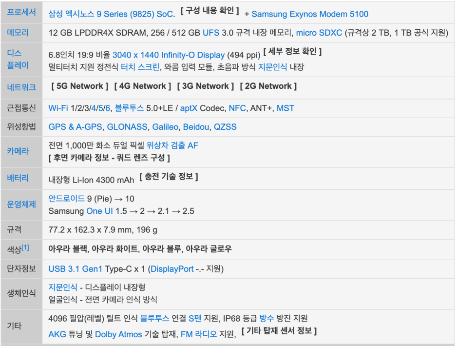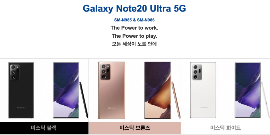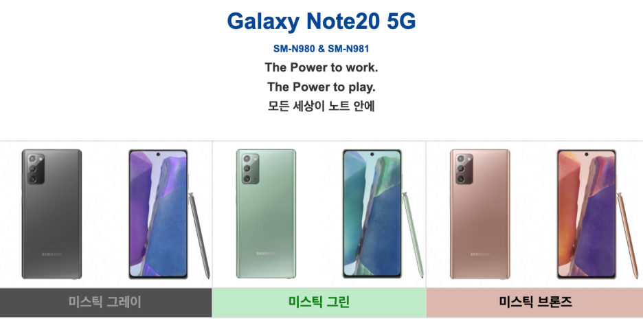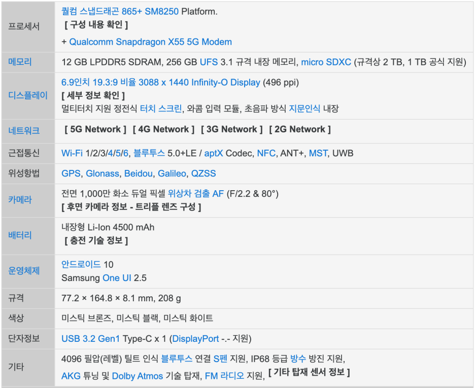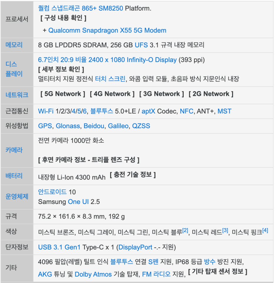노트20 | SM-N980 SM-N981 | 6.7인치 20:9 비율 2400 x 1080 Infinity-O Display (393 ppi) | 75.2 × 161.6×8.3 | 192 | 내장형 | [기본] 6,400만 | 1,000만 듀얼 픽셀