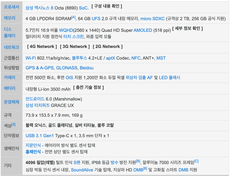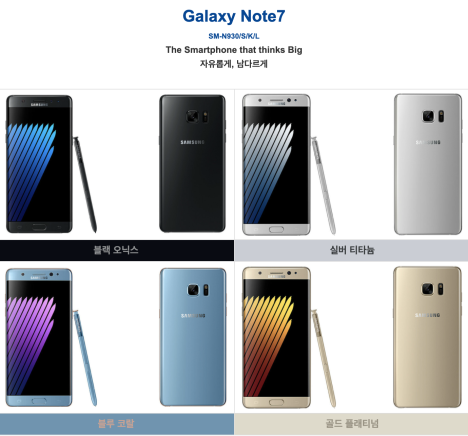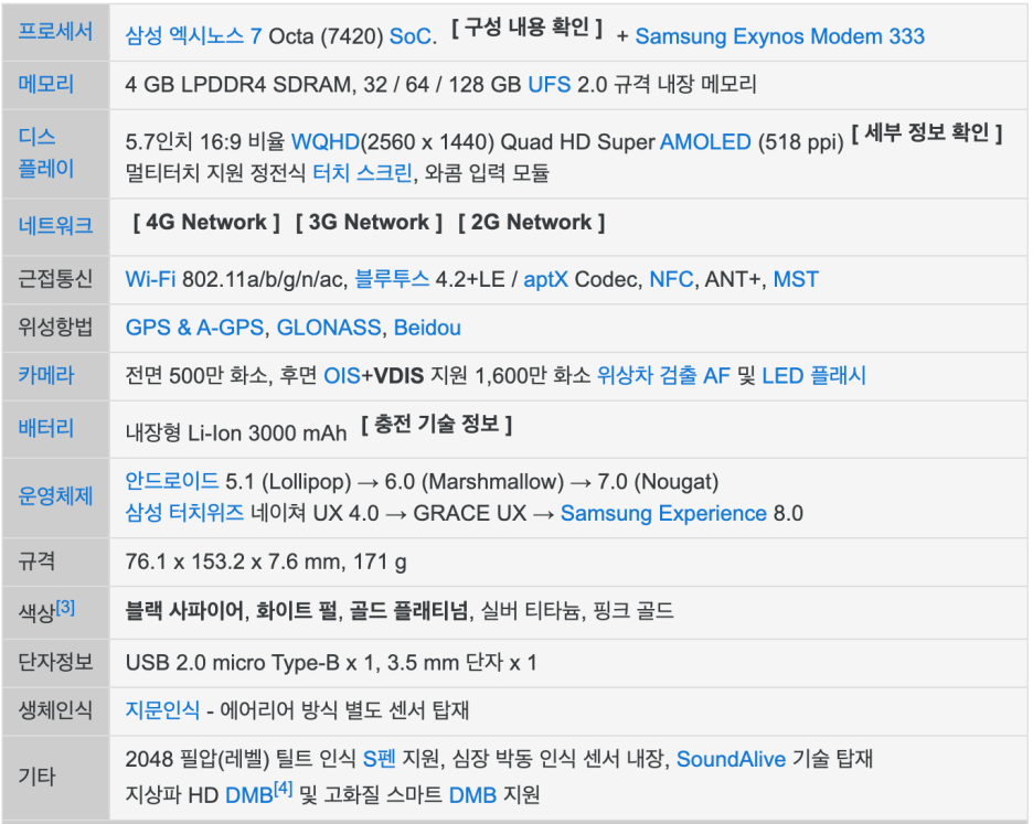 노트7 | SM-N930 | 5.7인치 16:9 비율 WQHD(2560 x 1440) Super AMOLED (518 ppi) | 73.9 x 153.5 x 7.9 | 169 | 내장형 | OIS지원 1,200만 듀얼픽셀 | 500만 | 16년 08.02 |