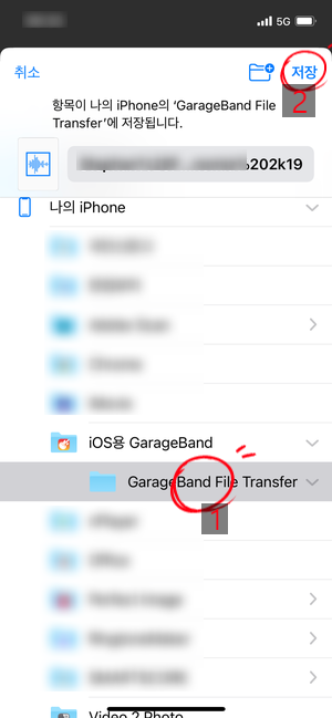 벨소리 파일을 눌러 "다른 앱에 저장"을 누르고(좌측), 나오는 화면에서 "파일에 저장"을 눌러서(중앙), 표시한 "GarageBand File Transfer"폴더에 저장합니다.(우측)